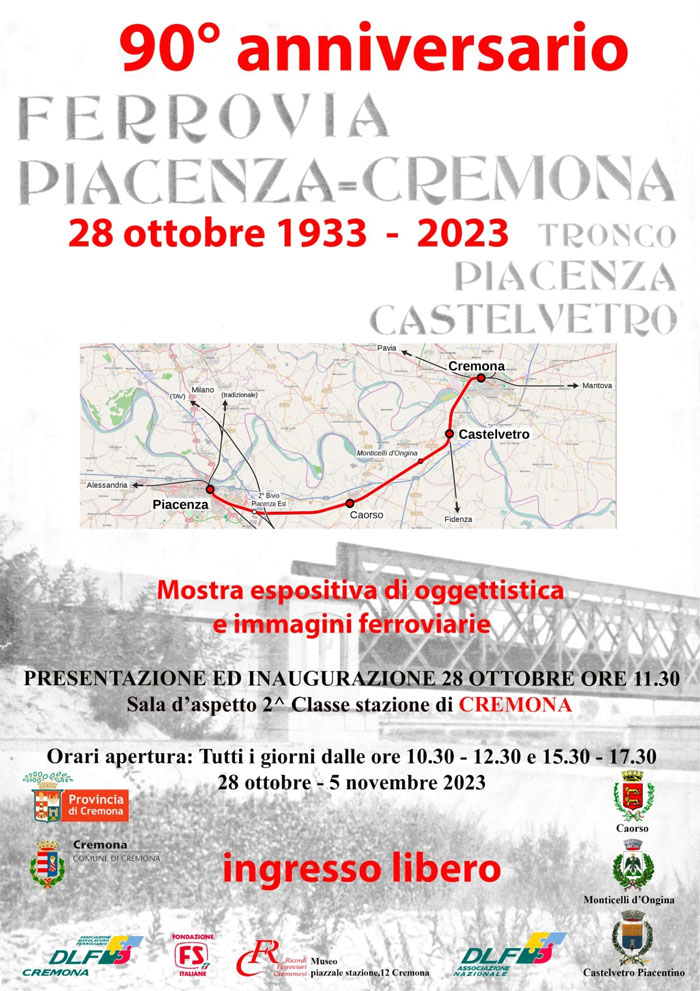 In occasione del “90° Anniversario della Ferrovia Piacenza-Cremona” (1933-2023) l’Associazione nazionale DLF – Dopolavoro Ferroviario e le sedi DLF di Cremona e Piacenza hanno realizzato una mostra che intende rendere omaggio alla cultura ferroviaria, cercando di evidenziare il ruolo che la ferrovia ha svolto e può rappresentare per lo sviluppo del territorio.