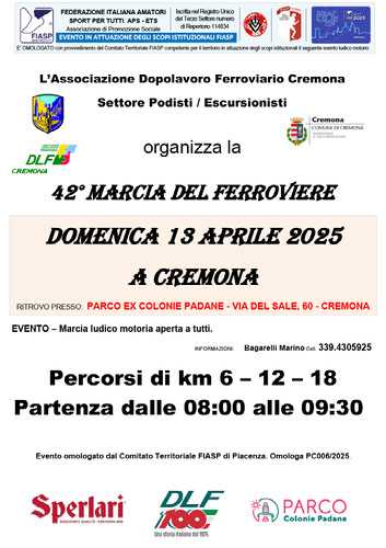 Domenica 13 aprile 2025 il Dopolavoro Ferroviario di Cremona – Gruppo Podisti/Escursionisti organizza la 42° Marcia del Ferroviere.